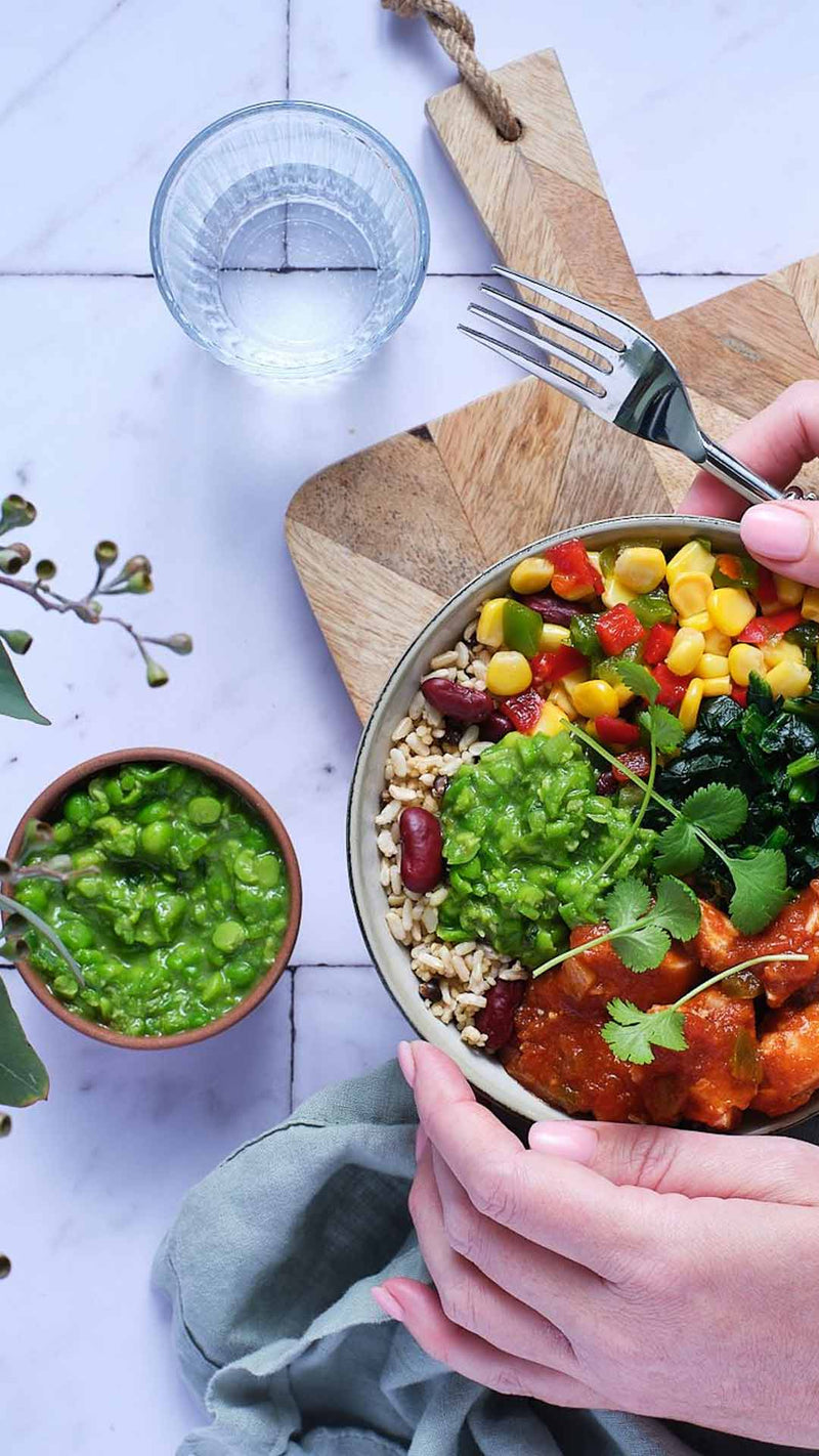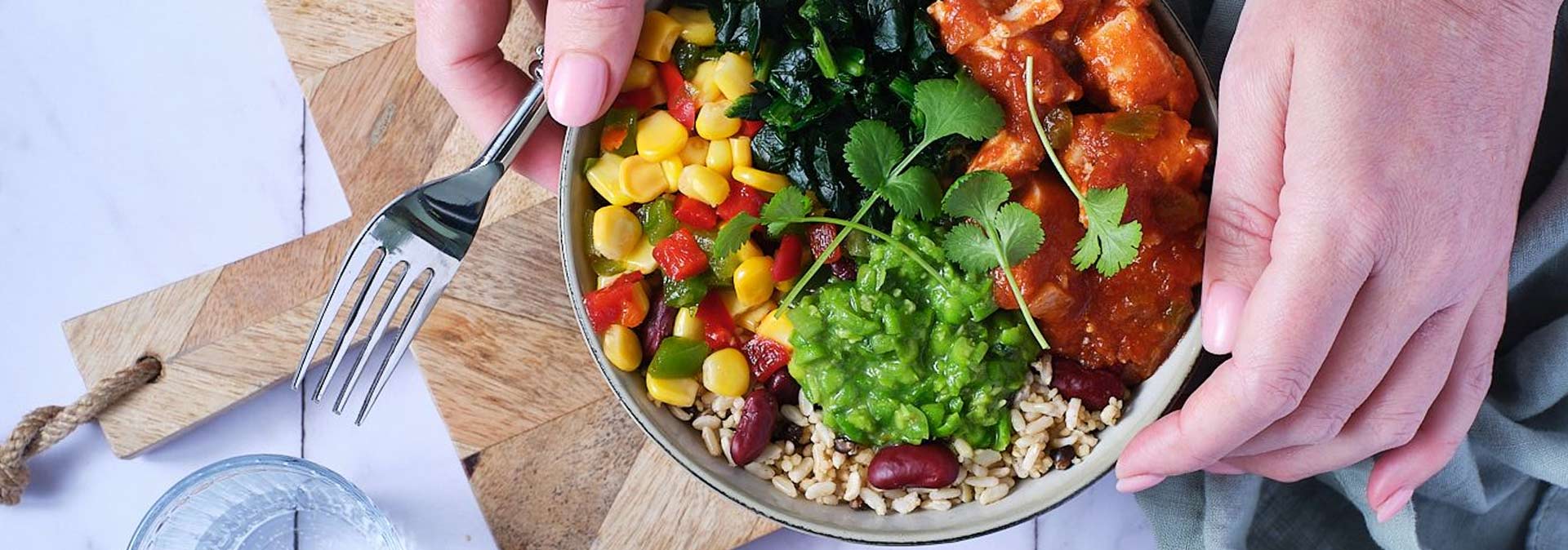Skip the take-out and try our super tasty Mexican Burrito Bowl with chicken and Guacamole.